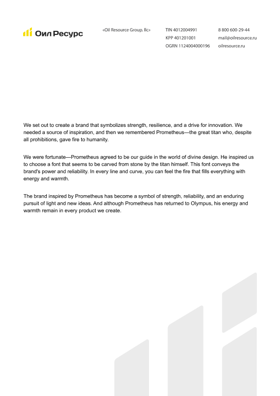 El esfuerzo de la empresa por innovar, incorporar nuevas tecnologías y transformarse nos inspiró a introducir el arquetipo de Prometeo en la marca. El fuego en el logotipo de Oil Resource, al igual que el fuego de Prometeo, simboliza:
