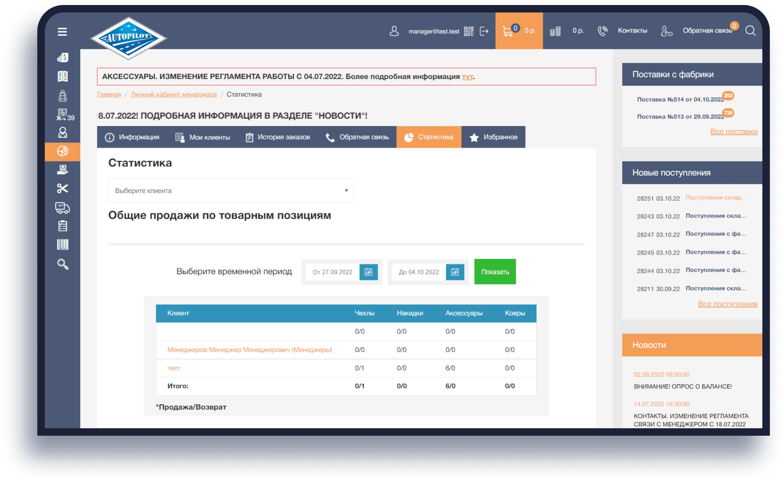 Se prevén dos roles: gerente y empleado de almacén. El área personal permite trabajar con pedidos y clientes, así como ver análisis de diversos tipos.