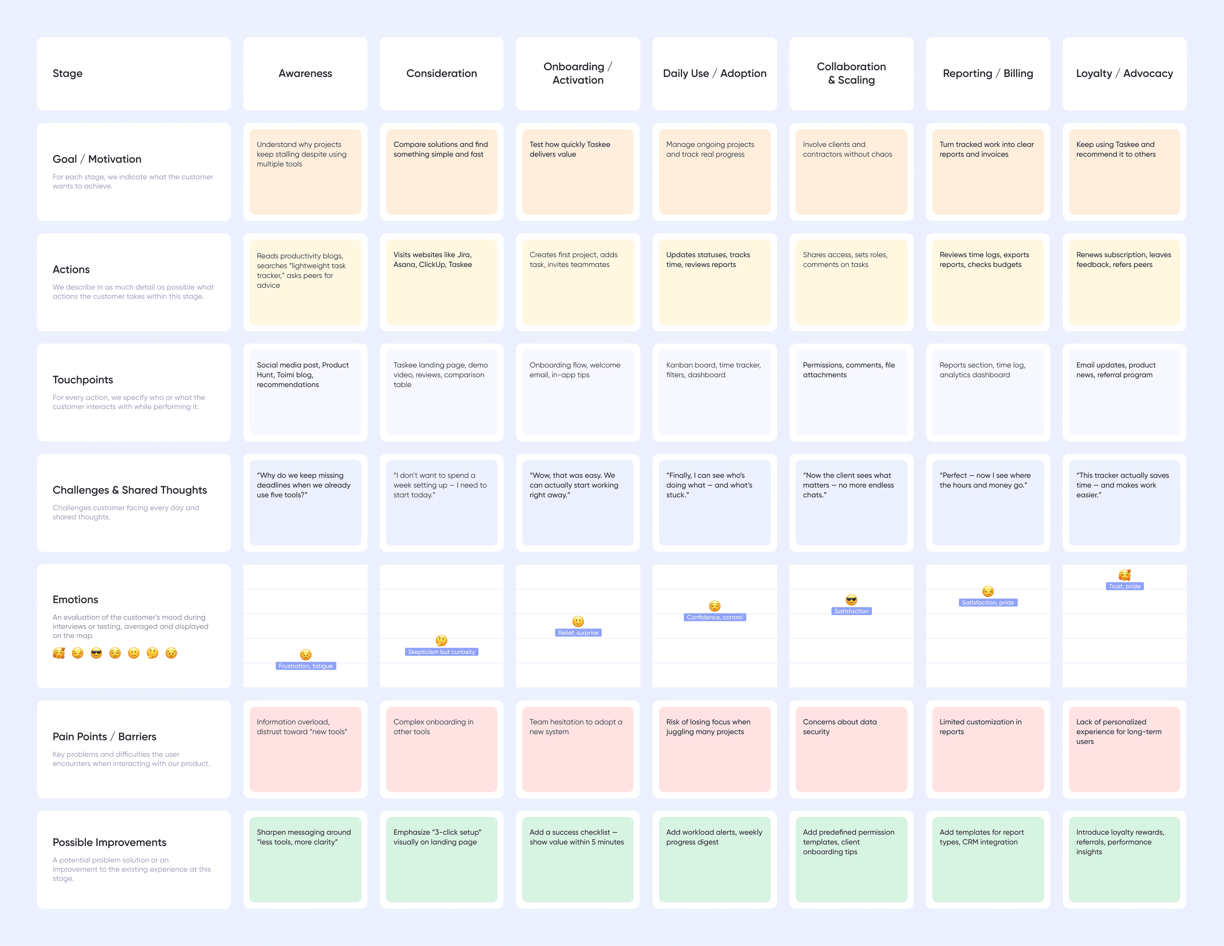 Taskee comenzó como una herramienta que creamos para nosotros, pero rápidamente se convirtió en algo más. Su arquitectura requirió cambios mínimos porque desde el principio se basó en las mejores prácticas de desarrollo de servicios online: lógica clara, sistema estricto de roles, API limpia y estructura escalable. Hoy nos ayuda a planificar trabajo, rastrear tiempo y coordinar el equipo en Toimi. Su estructura apenas cambió desde los primeros prototipos: no fue necesario.