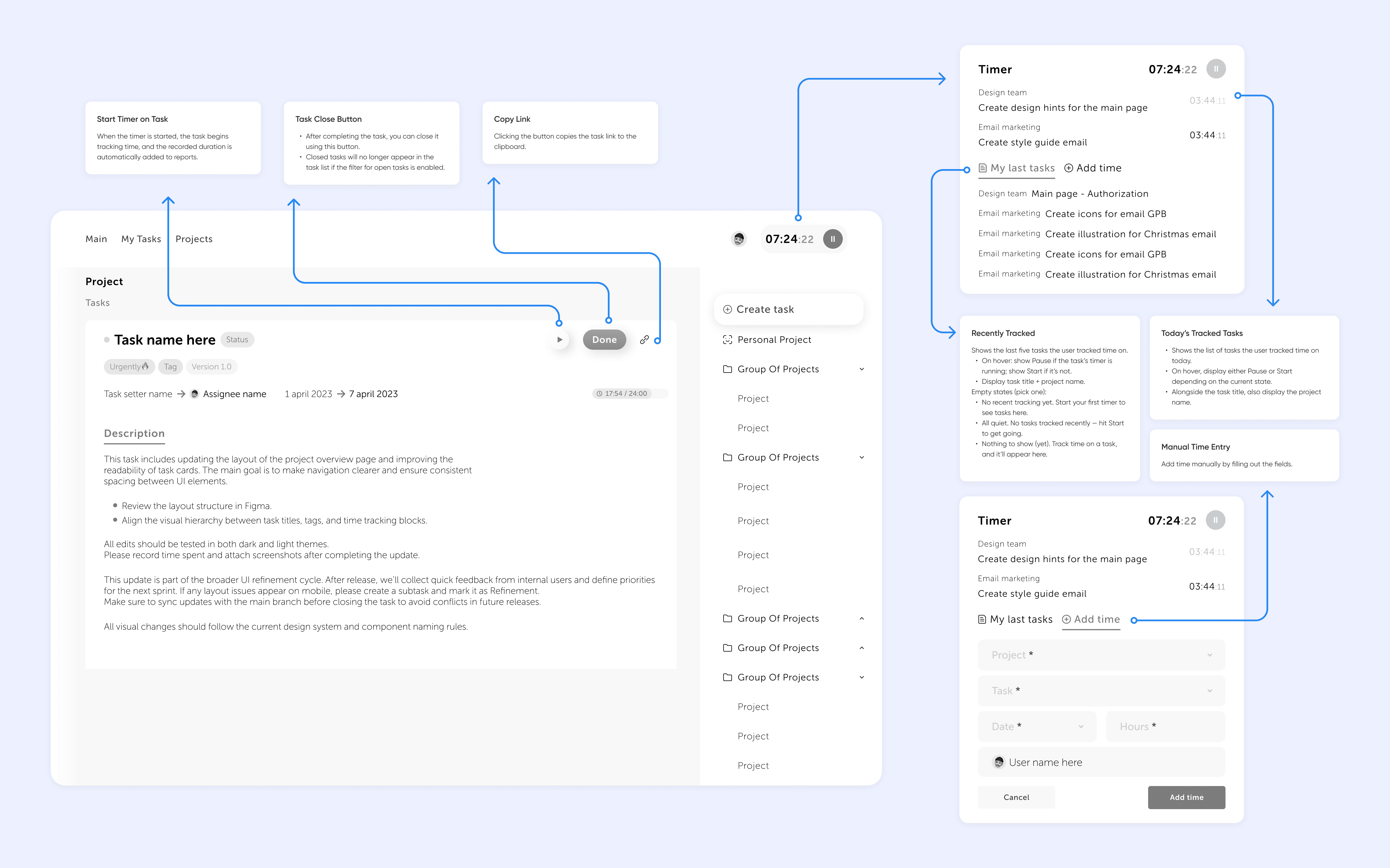 Creamos una interfaz tranquila y clara: sin ruido visual, sin elementos "decorativos". Solo lo que realmente ayuda a cerrar tareas. La lógica visual e interactiva se construye sobre nuestros principios de UX/UI claridad, enfoque y flujo de usuario predecible. Este mismo enfoque se refleja en la marca: colores neutros, tipografía limpia y tono moderado.